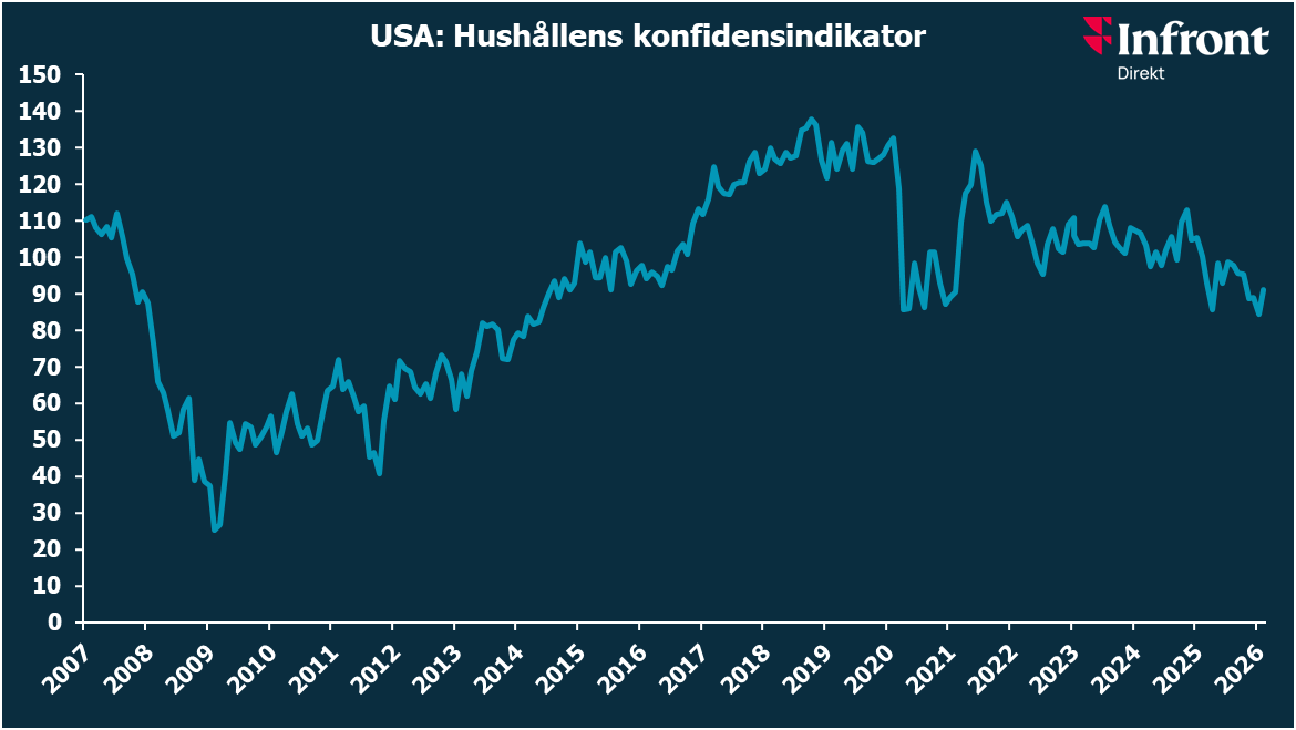 STOCKHOLM (Nyhetsbyrån Direkt) De amerikanska hushållens konfidensindikator steg till 91,2 i februari jämfört med 84,5 i januari.
